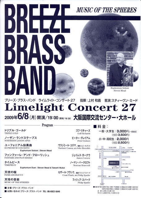 ブリーズ・ブラスバンド 演奏会のお知らせです。 恒例のライムライト・コンサートのお知らせです。 今回は、久々に世界的ユーフォニアム奏者、スティーブン・ミード氏との共演です。 前回は2003年12月でしたので、5年半ぶりの共演になります。 コズマのユーフォニアム協奏曲は必聴ですよ! 2009年6月8日(月) 大阪国際交流センター 大ホール 開場 18:30 開演 19:00 指揮 上村和義 料金 一般・大学生 3,000円 (当日 3,500円) 小・中・高生 2,000円 (当日 2,500円) チケ