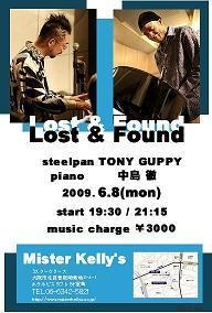 Lost&Found 〜steelpan & piano duo〜 Tony Guppy:steelpan 中島 徹:piano 2009年6月8日(月) Mister Kelly's http://www.misterkellys.co.jp/ TEL:06-6342-5821 JR大阪駅徒歩10分 /地下鉄 西梅田駅 徒歩3分 start:19:30/21:15 Music Charge:¥3,000 ハイスキル&マルチジャンルのトニーの演奏は、 「スティールパン=カリビアン」のイメージを覆し、日本の数々の名手を虜にしている。 最近ではポール・ジャクソン(b)との共演も話題に。 大阪でトニーを迎え撃つのは、音のコミュニケーションの達人・中島徹。