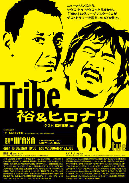 「M'AXA」 0598-56-4825 〒515-2121 三重県松阪市市場庄町1148-2 OPEN 18:30 START 19:30 前売り \2800 当日 \3300 藤井裕(Vo・G・B) ヒロナリ(Vo・G) Guest 松尾敦史(Dr)