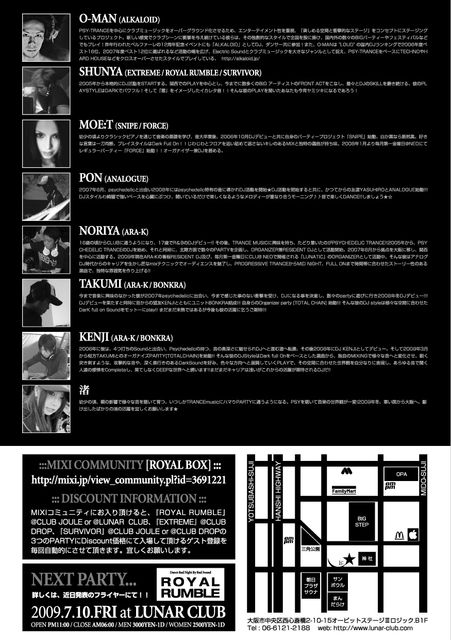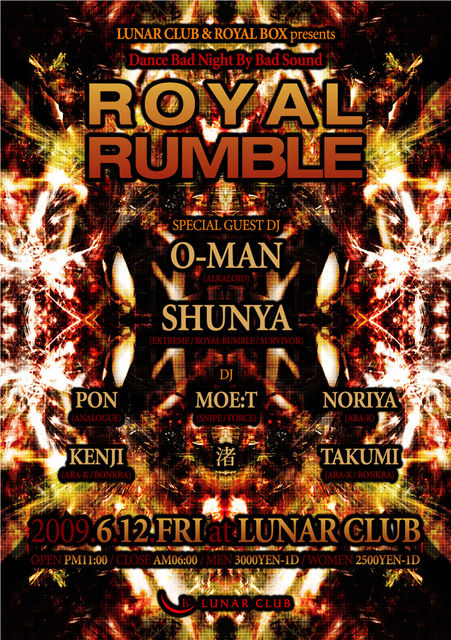 『ROYAL RUMBLE』が『6月12日金曜日』月のCLUBへ上陸!!SPECIAL GUESTにはCLUB JOULE等で大活躍のALKALOIDより『DJ O-MAN』、更には過激なサイケデリックパーティーEXTREME@CLUB DROPのメインDJ『DJ SHUNYA』が登場!!他にも人気、実力を兼ね備えたDJ陣が出演する豪華な豪華なラインナップ!!超満員のフロアーで、最高の音を感じ、何もかも忘れてを朝まで踊り狂って下さい!!
