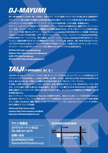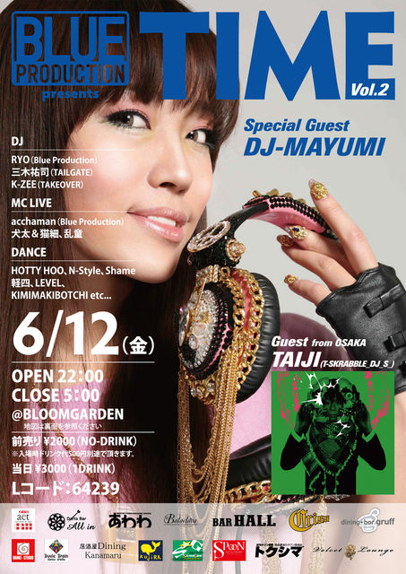 管理人様失礼いたします 〜BLUE PRODUCTION preseots〜 『TIME Vol.2 』 @BLOOMGARDEN OPEN / START --- 22:00 前売り---\ 2,000 (NO DRINK) 当日---\ 3,000 (1D) - SPECIAL GUEST - DJ MAYUMI - GUEST - TAIJI(T-SKRABBLE DJ S) - DJ - RYO(Blue Production) / 三木祐司(TAILGATE) / K-ZEE(TAKEOVER) - MC - acchaman / 犬太&猫細 / 乱童 - DJ MAYUMI - HIPHOP関係者からDJ界の“姫”と呼ばれ、現在クラブ、ラジオで数多くのプレイをこなす超人気DJ。全国各地のクラブ、イベント、更には海外でも活動