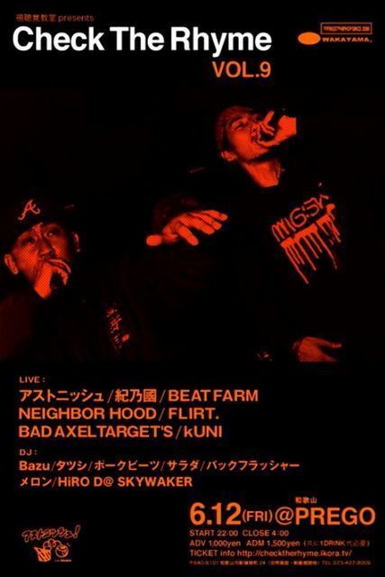 視聴覚教室presents Check The Rhyme vol.9 6月12日(金)@和歌山PREGO TICKET:前売り1,000円 当日1,500円 (共に1DRINK代必要) ●LIVE アストニッシュ 紀乃國 BEAT FARM BAD AXEL TARGET'S NEIGBOR HOOD kUNI FLIRT. ●飛び入りLIVE オキシ ●DJ Bazu タツシ ポークビーツ サラダ バックフラッシャー メロン HiRO D@ SKYWAKER ※前売りTICKETのお問い合わせ、メッセージお待ちしております。