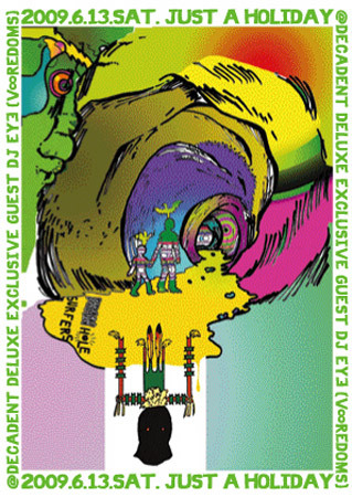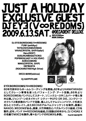 山塚アイ、山塚EY∃、ヤマタカ・アイ、DJ光光光、SKYEYE、WEYEWなどなど、さまざまな変名をもち――ボアダムスを牽引しつつ、ハナタラシ、ノイズ・ラモーンズ、UFO or DIe、オーディオ・スポーツ(大友良英のユニット)、ネイキッド・シティ(ジョン・ゾーンのユニット)、Z-Rock Hawaii(ウィーンとのユニット)、想い出波止場(山本精一のユニット)、Praxis(ビル・ラズウェルのユニット)で活動。DJとしても絶大な人気を誇る言わずもがな、現代日本を代表する前衛音楽家 EYEさんが"JUST A HOLIDAY"に登場です!!!!