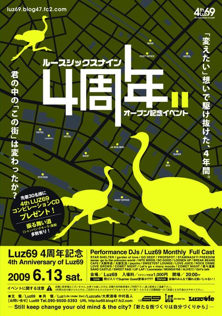 ついにLUZ69 4周年です!! 「変えたい」想いで駆け抜けた、4年間 君の中の「この街は」変わったか? LUZ69 4周年記念 -4th Anniversary of LUZ69- ■2009/6/13 sat 20:00- start ■@LUZ69 http://luz69.blog47.fc2.com/ ■DOOR 1000yen(1D) ■Performance DJs LUZ69 Monthly Full Cast ☆ほんと沢山の方にPLAYして頂いてます!! STAR SHELTER (DJ-butch) garden of love (DJ-okutani / metro / butch) GO DEEP (DJ-okutani / KAOL / ren / KAZUMA) PROPSPOT (DJ-TAK / NO-BEE / VAS / KENGO / SEIJI /