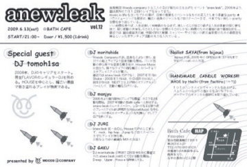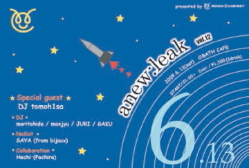 管理人様告知失礼します。 anew:leak 2009.6.13 (SAT) @ BATH CAFE (富山総曲輪) vol.12 OPEN : 21 : 00 ENTRANCE FEE : 当日のみ : 1,500yen (with 1drink) DJ : moritahide / manjyu / Juri / GAKU Nailist : SAYA (from bijoux) Decoration : しのびぃ / asako Staff / /hitomi / MZK Art Design / takuya / そらみー 音楽集団 Woods Company から3人のDJが立ち上げたイベント "anew:leak"。200 6年より、富山某所にて月1、2回のレイブを行ってきた。 music is lifeをコンセプトに掲げ、日常