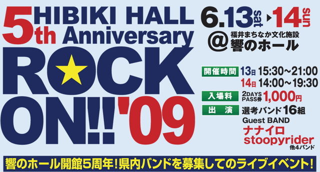 福井まちなか文化施設「響のホール」開館5周年記念イベントにGENOCIDEがゲストバンドとして出演します。 【タイトル】HIBIKI HALL 5th Anniversary ROCK ON!! '09 【日程】6/13(土) 6/14(日) ※GENOCIDEは6/14に出演します。 【場所】福井まちなか文化施設「響のホール」 【料金】2DAYS PASS券1,000円 【出演・タイムテーブル】 6/13(土)15:30〜21:00 15:30 宴屋本舗 16:15 GUN-WOO 16:50 DEEP INFECTION 17:25 ARt spiral 18:00 ナナ・イロ 18:45 ザ☆バンジーズ 19:20 boogie