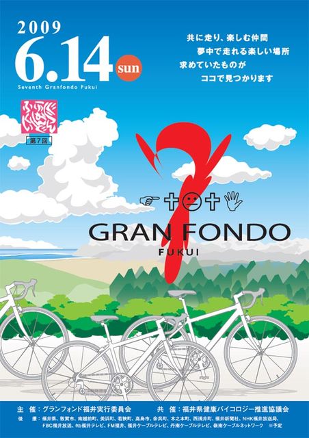 ことしのグランフォンド福井の開催要項が発表されました。 皆さん、一緒に走りましょう。 毎年参加者が増加し、かなり早い時点で申し込みが打ち切られています。 どうしょうかな?と考えている方は、迷わず今すぐ申し込みしましょう。 詳しくはこちら。 http://granfondofukui.com/