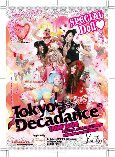 *:..。o★Tokyo Decadance special DOLL★o..:* 日時 6月20日(土曜日)23:00 OPEN 場所 TRUNP ROOM 住所 東京都渋谷区神南1-12-14 星ビル3F/4F 電話 03-3770-2325 料金 door 3500yen, with flyer 3000yen, dress code* 2500yen 地図 http://www.mapion.co.jp/c/f?uc=1&grp=all&nl=35/39/34.596&el=139/42/13.644&scl=25000&bid=Mlink ☆.+゚'・:*+☆.+゚'・:*+☆.+゚'・:*+☆.+゚'・:*+☆.+゚'・:*+☆.+゚'・:*+☆.+゚'・:*+☆.+゚'・:*+☆ 今度のデカダンスは『スペシャル・ドール』 可愛いだけじゃつまらない!異色ドールたち