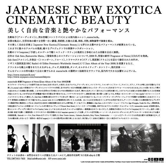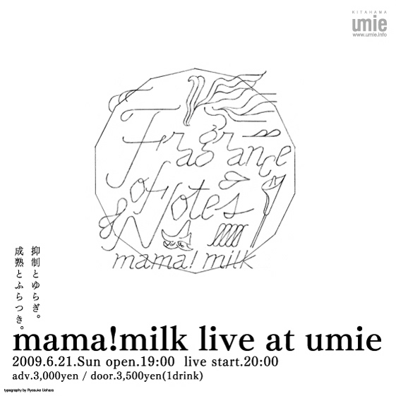 JAPANESE NEW EXOTICA CINEMATIC BEAUTY 美しく自由な音楽と艶やかなパフォーマンス 生駒祐子(アコーディオン)と、清水恒輔(コントラバス)による室内楽ユニットmama!milkのライブが決定しました。 ジャズ、映画音楽、タンゴ、オルタネイティブ・カントリー、現代音楽 ……そんなジャンルの枠を越えて 自由に奏でられる mama!milk の濃密かつ独創的なサウンド、そして艶やかなパフォーマンスがumieに初登場です。 当日はmama!milkスペシャルメニューも用意していますのでお楽しみに。 http://www.mamamilk.net/ 抑制と