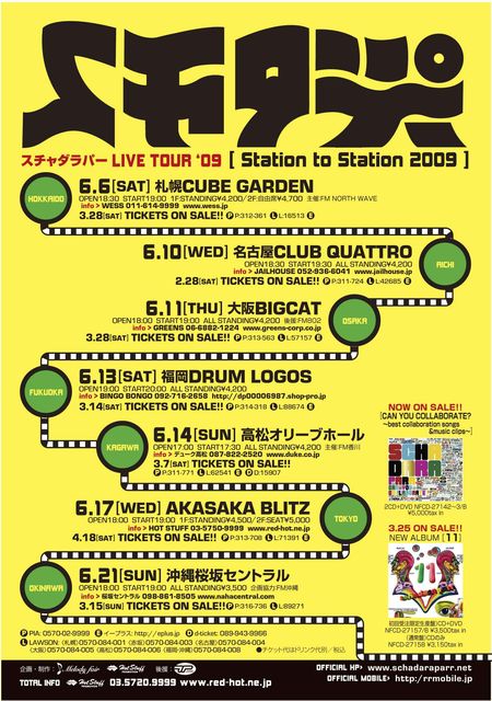 スチャダラパー LIVE TOUR '09 『Station to Station 2009』 LIVE: スチャダラパー SUBMARINE OPEN / 18:00 START / 19:00 前売り / 3,500円(別途ドリンク代) 当日 / 4,000円(別途ドリンク代) ※オールスタンディング チケットぴあ【Pコード 0570-02-9999】 ローソンチケット【Lコード 0570-084-008】 桜坂セントラル:那覇市牧志3-9-26 1F [098-861-8505] http://www.nahacentral.com