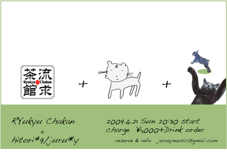 『Ryukyu Chakan + hitori#9/juru*y』 2009.6.21(Sun) 20:30start at 流求茶館 (牧志1-3-17 098-862-3031) 1,000yen + 1D order 出演:juru*y/hitori#9(アコースティック弾き語り) いつもお世話になっている流求茶館さんにて久しぶりのライブです。 ゆったり楽しんで頂くため、ご予約優先20名様限定になります。 定員に達し次第、締め切らせて頂きますのでご容赦下さい。 お時間とお財布に余裕のある方は是非。 その他お問い合わせ juruymusic@gmail.com
