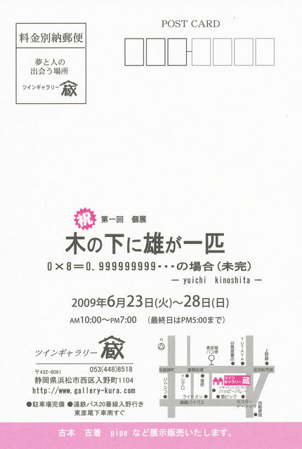 祝第一回個展のお知らせ 6月23日〜28日 静岡県 浜松市 ギャラリー蔵にて 『木の下に雄が一匹』 0×8=0.999999999の場合(未完) 「これは秘密主義の反逆だ!」 ーyopparai Records (BGM ) 「生きていくための彼なりのパーティーだ」ーパラレルワールド社 この展示会は私、木下雄一の美術並びに芸術への敬意、オマージュである。 私が見たり聞いたり味わったすべてに捧げたい。感謝 糧になることを切に願う。 絵画約20点 古着(木下コレクション)Pipe,縄文土器(パラレルワールド社)古本少々(木下セレクション
