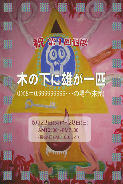 祝第一回個展のお知らせ 6月23日〜28日 浜松市 ギャラリー蔵にて 『木の下に雄が一匹』 0×8=0.999999999の場合(未完) 「これは秘密主義の反逆だ!」 ーyopparai Records (BGM ) 「生きていくための彼なりのパーティーだ」ーパラレルワールド社 この展示会は私、木下雄一の美術並びに芸術への敬意、オマージュである。 私が見たり聞いたり味わったすべてに捧げたい。感謝 糧になることを切に願う。 絵画約20点 古着(木下コレクション)Pipe,縄文土器(パラレルワールド社)古本少々(木下セレクション) 当