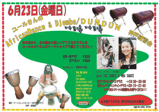 http://uruma.ap.teacup.com/waraba/460.html ユールさんの African Dance & Djembe / Doun Doun 神戸練習会 体の芯から、心の底から楽しいアフリカのリズムを ユール&ミナさんのワークショップで感じて下さい! 6/23(fri) アフリカン・ダンス クラス 18:30-20:00 ジェンベ/ドゥンドゥン クラス 20:15-21:45 ★やりたいパートの楽器をお持ち下さい! ★太鼓クラスの方、椅子持ち込み大歓迎! 会費 各クラス ¥3,000 2クラスセット ¥5,000 *レンタルジェンベ(要予約)¥