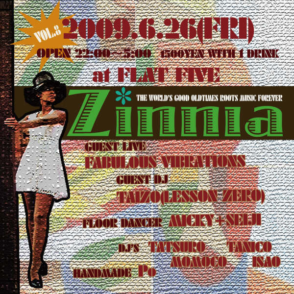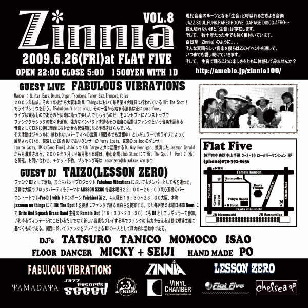 管理人様、告知失礼します。 神戸で生音中心のレギュラーイベント”Zinnia”やってます。 今回は大阪を代表するファンクDJ TAIZO氏率いるFABULOUS VIBRATIONSをお呼びしてます。 Bebopダンサーとのセッションもあり!盛り上がる事まちがいなし! 生音が好きな方、ダンサーは必見ですよ♪ ★☆Zinnia vol.8★☆ -the world's good oldtimes roots music forever- 2009.6.26(FRI) @flat five open 22:00〜5:00 1500yen with 1d Guest Live:FABULOUS VIBRATIONS Guest DJ:TAIZO(LESSON ZERO) Floor Dancer:MICKY+SEIJI(