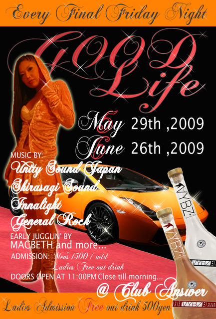 告知失礼します。 -jps presents- ■GOOD LIFE■vol,3 2009,6,26[fri] @club ANSWER OPEN/START 23:00-ALL NIGHT ADM:LADYs FREE!!! [out1D] MENs 1000yen[out 1D] -MUSIC BY- UNITY SOUND JAPAN SHIRASAGI SOUND INNALIGHT GENERAL ROCK MAC BETH RASKILL 兵庫県を中心に活動するUNITY SOUND JAPAN,SHIRASAGI SOUND INNALIGHT,GENERAL ROCK をメインに朝まで続く間違いなく踊れるDANCE!!! もちろん最新GANGSTA TUNEから80s 90s RnB Hip Hopまで幅広くかかり しかも女性入場無料!!!!!!!! 毎月最終金