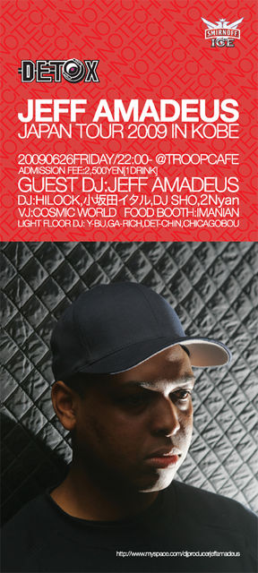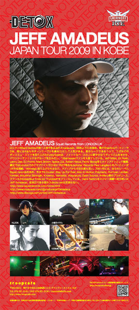 TROOPCAFEがプロデユースする唯一のハードテクノパーティーがDETOXだ!前回までは日本最強のテクノDJ石野卓球氏をレジデントゲストとして開催し人気を博してきたDETOXが初の海外アーティストを迎えて開催決定!! スペシャルゲストとして登場するのは、ロンドンのハードテクノの第一人者であるJEFF AMADEUSだ!数々のTECHNOパーティーで3台、時には4台ものターンテーブルを自在に操るDJとして注目を集め、彼のルーツであるラップ、ラガなどを取り入れたFUNKYなSETは、ファットなベースの上に鮮やかなラテンリズムをきかせ、TRIBAL HOUSEファンをも