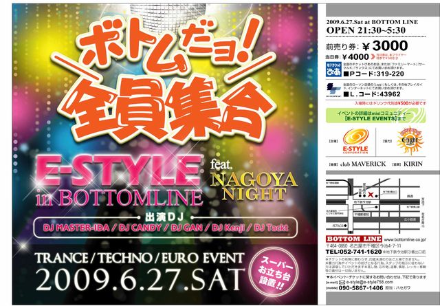 いよいよ1ヶ月きりました 今年前半戦一番ののBIG EVENT E-STYLE in BOTTOMLINE feat. NAGOYA NIGHT このBIG EVENTまでの1ヶ月間、 チケット買った人も、 これから買う人も、 迷ってる人も、 当日残念ながらこれない人も、 このトピで盛り上がろうじゃありませんか イベントの質問 リクエスト バースデーの告知 要望等々 ぢゃんぢゃん書き込んでってください