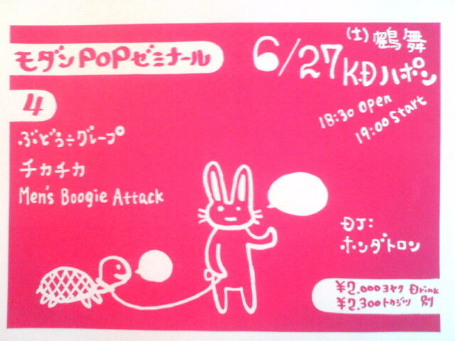 "モダンPOPゼミナール4" 6/27(土)開場&DJスタート18:30 ライブ開始19:00 予約\2000 当日\2300 ともに+1dオーダー LIVE/ぶどう÷グレープ チカチカ Men's Boogie Attack DJ/ホンダトロン MUSICよりMUZIK、ミュージックよりミューヂック。そんなフィーリングにピンとくる人は是非注目してください!良質なポップミューヂックの連打で毎回大きな盛り上がりをみせている「モダンPOPゼミナール」は今回で4回目。これまでハポンにおける同イベントは、デジタル系POP vs 人力的シンセPOPのバトルといった雰囲気で、良質なテクノ、ニューウェーブな
