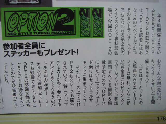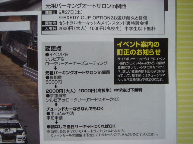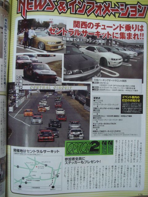 みなさんお久しぶりです そろそろオフ会でもどうかと思っていたところにいいお話が 来たる6月27日、セントラルサーキットで、 『元祖パーキングオートサロンin関西』と『EXEDY CUP OPTION2お遊び耐久』の併催イベントがあります このイベントでは参加車両すべて撮影&掲載予定ということなので 雑誌に載りたい方はチャンスです! スープラの台数が集まれば並べたりしてみたいですねぇ お友達いっぱい誘ってください〜♪ OPT2からの抜粋ですが、 開催地 セントラルサーキット内メインスタンド裏特設会
