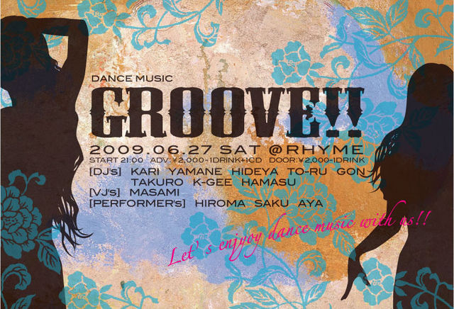 DANCE MUSIC の楽しさを色々な方に楽しんで頂ける空間作りをコンセプトに、DANCE PERFORMER, SINGERのLIVEやDANCE SHOECASEを開催するなど様々な雰囲気作りにも取り組んでいます。 女の子もclubが初めての方も楽しんで頂けるイベントです!!!! GROOVE!! @ RHYME Let's enjoy DANCE MUSIC with us!! 2009.06.27 Sat. 21:00 START DJ's KARI YAMANE HIDEYA TO-RU GON K-GEE HAMASU VJ MASAMI PERFORMER HIROMA SAKU AYA しゅん TAKURO KAYO MIZUHO ADV. \2000-1d-1CD DOOR.\2000-1D ※