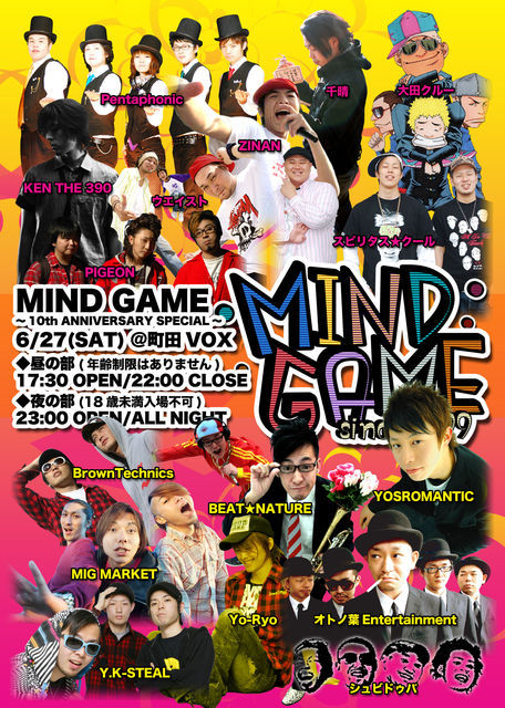 MIND GAME 〜10th ANNIVERSARY SPECIAL〜 at MACHIDA VOX 2009/6/27(SAT) ●昼の部(年齢制限はありません/小学生以下入場無料) 17:30 OPEN/18:00 START 22:00 CLOSE ¥2500(1ドリンク付) ※チケットのお取り扱いについて 昼の部は、前売りチケットの販売、及びディスカウントゲスト等は一切ございません。当日券のみのご案内となります。 当日券をお求めの方は、当日(27日)午後3時より整理券を配布します。 (先着200枚/お一人様2枚まで) 整理券をお持ちの方から、優先的にご入場とさせていただきます。 LIVE: 大