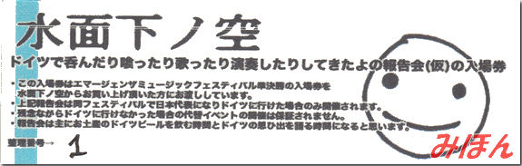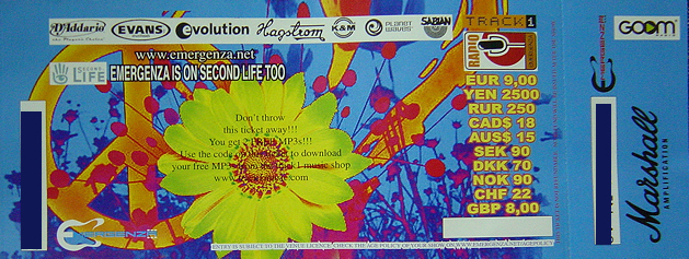 無事、準決勝(セミファイナル)を通過しました^^ 次回は6月28日(日)に決勝ファイナルです! ◆◆◆ Emergenza Music Festival ファイナル ◆◆◆ 期日 : 2009年06月28日(日) 会場 : 渋谷 O-EAST 時間 : OPEN 16:30 / START 17:00 予定 : 出番は当日に18:40か19:05か19:30か19:55のいずれかに決まります。 チケ : ADV \3,000 / DOOR \4,000 (+1D別) 出演 : H3F / 男舟 / BAZZ TUNER / 凛 -LIN- / ぐるぐる / THE MODESTY TRIBAL ABILITY / 水面下ノ空 / ANGRY PENGUIN ROBO / ワゴム / EUPHIO / ミツマッシュ ▼渋谷
