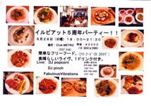 イルピアット5周年パーティー!! 6.28(sun) @Club METRO 18:00〜21:30 3,000yen(〜19:30より2,000yen) with Welcome Food (〜19:30) & 1drink LIVE:popcorn / pinch / FABULOUS VIBRATIONS INFO:ClubMETRO(075-842-1890), il piatte(075-752-4765) かつてZEROのパーティのフードクルーだった トニーさんの素敵イタリアン@京都円町の 開店5周年パーティ! 耳もお腹もココロもまんぷくに!