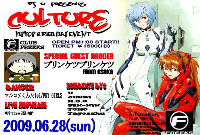 DJ.U PRESENTS HIPHOP & R&B DAY EVENT CALTURE VOL.2 6/28(SUN) @FREEKS (舞鶴市堀上35 GEOビル1F) START PM2:00〜7:00 TICKET 1500(1D) ☆SPECIAL GUEST DANCER☆ 読売TV『スーパーチャンプル』 ・プリンケツプリンケツ FROM OSAKA ☆DJ's☆ ・DJ.U ・DJ.JUNZI ・DJ.M.C.O ・DJ.SEN-NIN ・DJ.TOMO ・DJ.TAGOSAKU ☆DANCER☆ ・マルコメ君 ・Ciel ・FRY GIRLS ☆LIVE SHOWCASE☆ ・斬The忍者