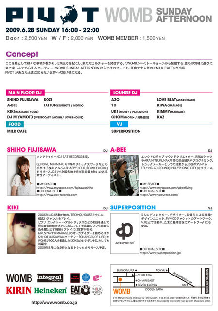 2009年6月28日<WOMB>=<トーキョー>で新しいパーティーを開催!! テクノ、ハウスを中心にした固くて太い音 SUNDAY AFTERNOON を最大限に生かしたFOODやHAIR MAKEなどのブース 今、トーキョーの日曜の午後が一番熱い!!!! 【PARTY NAME】 PIVOT 【DATE】 2009/6/28(SUN) 16:00〜22:00 SUNDAY AFTERNOON 【CONCEPT】 ここを軸として様々な事物が繋がり、化学反応を起こし、新たなカルチャーを発信する。 <WOMB>=<トーキョー>から発信する、誰もが気軽に遊びに来て楽しんでもらえるパーティー。 WOMB SUNDAY AFTERNOONな