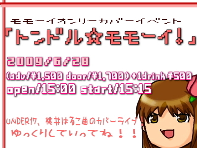 こんばんは、スペースをお借りいたします。 桃井はるこさんの出演など全くないカバーイベントの告知です。 ※ご本人様、所属事務所様、avex marcketing様などとは一切関係ございません。 問い合わせたりなさらないようお願いいたします。 6月28日…大阪ではドリームパーティー出演、その前後日も「☆自演乙☆ソング」のインストアイベントなど行われます。 だけど、大阪までは行けないんだー!っという東にお住まいの方、モモーイの曲でトンドルしませんか?ついでにヲタ踊りもヽ(´ー`)ノ 日付:2009年6月28日 場所:秋葉原