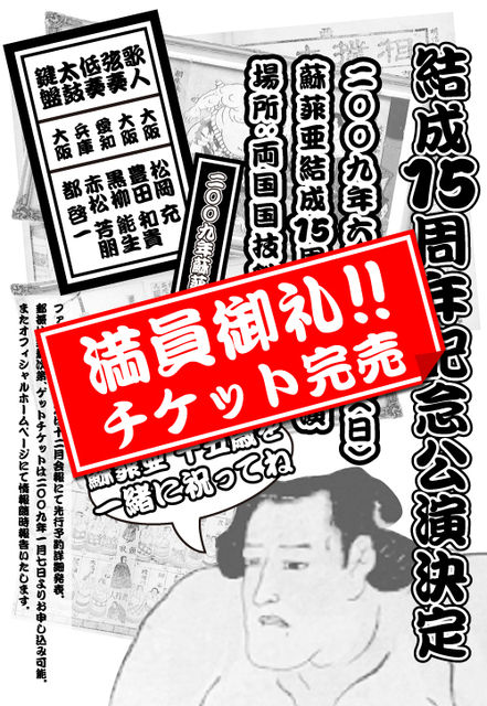 チケットも届き始めたようですね SOPHIA 15周年 Anniversary year SOPHIA 結成15周年記念公演 IN 両国国技館 参加されますか ※今回親睦会の予定はありません。 ↓ グッズ列・会場の様子・SOPHIAns同士の交流の場に利用してください。 http://mixi.jp/view_bbs.pl?id=43829406&comm_id=1956575 電車アクセス JR総武線各駅停車 両国駅西口下車徒歩2分 都営地下鉄大江戸線 都営両国駅A3出口下車徒歩5分