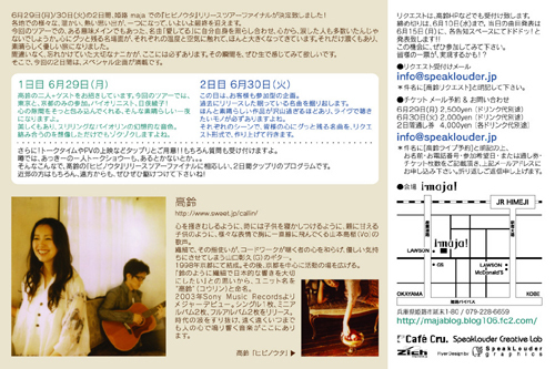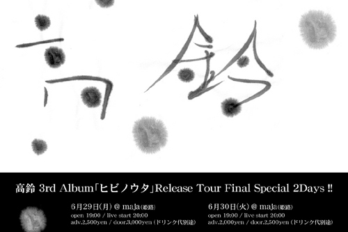 管理人様、告知失礼致します。 6月29日(月)/30日(火)の2日間、姫路 maja での『ヒビノウタ』リリースツアーファイナルが決定しました! ○まずは1日目。 高鈴の二人+ゲストをお招きしています。 バイオリニスト、日俣綾子!!!!! 心の隙間をそっと包み込んでくれる、そんな素晴らしい一夜になりますよ。 美しくもあり、スリリングなバイオリンの幻想的な音色。 絡み合うのを想像しただけでもゾクゾクしますね。 ○そして2日目。 この日は、お客様も参加型の企画。 過去にリリースした眠っている名曲を掘り起しま