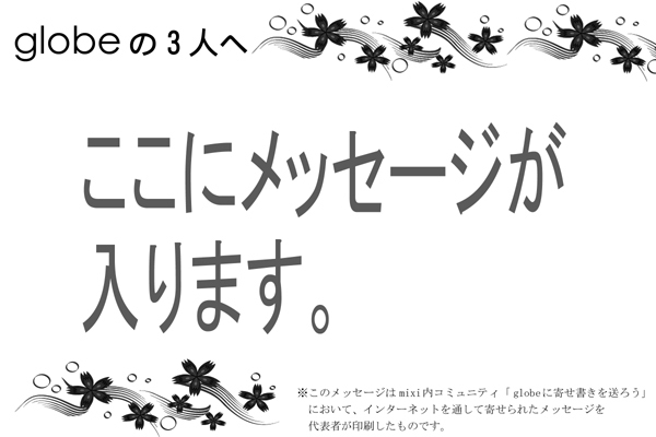本命寄せ書きイベントとは別に、 今のglobeに、今の私たちの気持ちを伝える期間限定の寄せ書きイベントです。 期間限定ですが、主旨はコミュニティTOPに書かれたものと同じです。 「globeのメンバーに寄せ書きを送ろう。 私たちの思いをメンバーに伝えよう。 」 今回は6月中にアルバム台紙にメッセージを集め、 エイベックスにファンレターとして送付します。 みんなの手書きのメッセージをglobeへ…… との思いから、今回の参加方法を設定しました。 * 寄せ書き方法は2通りあります。 【mixiメッセージで寄せ書き】or【郵送で