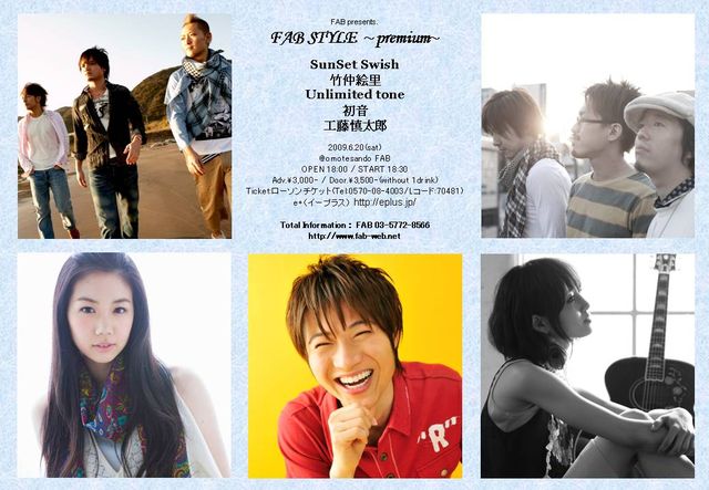 好評を頂いておりますマンスリーイベント「FAB STYLE」のスペシャル版が遂に本日開催です! 今回も頭から最後まで豪華メンバーで見ごたえある内容になるはず☆ 前売りチケットはおかげさまで完売致しましたが、当日券が若干ですがご用意出来る予定です。 この日にしか見れない、全員でのセッションや、全員のサイン入り色紙のプレゼントなど、 今回もこのイベント恒例の大好評企画を予定しております。 最高の土曜の夜を皆で感動しにきてください!! 公演タイトル■FAB STYLE 〜premium〜 会場■表参道FAB 公演日程■2009年6月20日(