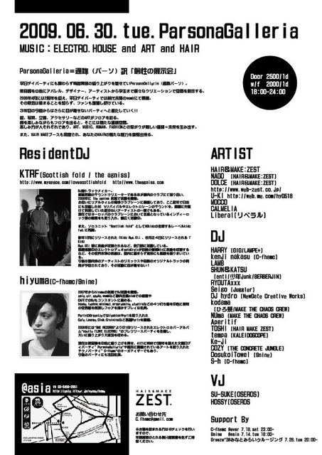 管理人様+。 貴重なスペース失礼致します*** おかげさまで3年目を迎えたパーソです^^ 人、音、アート、ファッション… さらにより多くの人が楽しめるように少しづつ成長していきます‖ ぜひ遊びに来て一緒に楽しんでほしいです**♪ Discount希望の方やお手伝いしたいという方など 気軽にメッセージにてお聞きください^^* 2009.06.30.tue □ParsonaGalleria□@asia HP→http://asia.iflyer.jp/venue/ □OPEN18:00-24:00 DOOR:¥2500/1d w/f: ¥2000/1d -----------------------