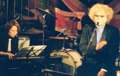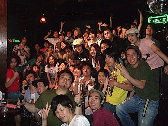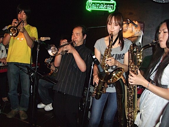 このイベントではステージを使わずに、ホール中央にバンドが車座になって演奏します。お客さんはそれを取り囲むかたちで席があります。写真二枚目、前回のようすをごらんください。これ面白いですよ。位置を移動すると見え方も変わるし音のバランスも変わります。好きな角度を選べて興味深いですわ。ドラマーの足さばき