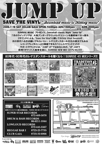 次の世代へも残していきたいレゲエダンスホール文化の根源でもあるレコードプレイを存分に堪能できるサウンドナイト!!サポートサウンドにはJUMP UPではもうおなじみのUP JAM!!