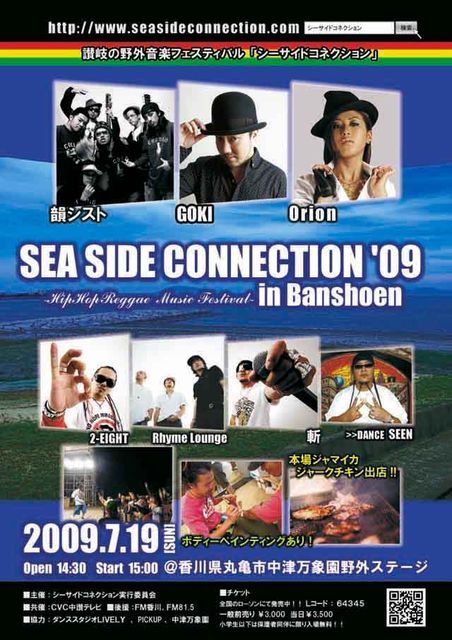 ------------------------------------------- 〜四国 讃岐の野外音楽フェスティバル〜 「SEA SIDE CONNECTION'09」 ------------------------------------------- 瀬戸内海に面した野外ステージ、サンセット といった最高のシュツエーションの中でで熱い ライブが繰り広げられる!! ライブのみならず、ボディペインティングブース や露天も出店!お楽しみに 2009/7/19(sun) @香川県丸亀市 中津万象園 野外特設ステージ Open14:30 Start15:00 ****CAST**** <LIVE> 韻シスト(生バンドhiphopユニット) GOK