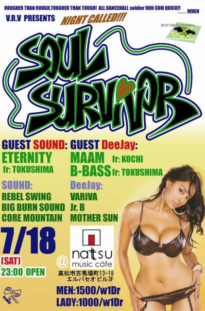 V.R.V PRESENTS 《SOUL SURViVOR》 @nattsu music cafe (高松市古馬場町 13-16 エルパセオビル 3F) 7/18(SAT) OPEN 23:00 ADM:MEN 1500 W/1Dr LADY 1000 W/1Dr GUEST SOUND: ETERNITY from徳島 GUEST DEEJAY: MAAM from高知 B-BASS from徳島 SOUND: REBEL SWING BIG BURN SOUND CORE MOUNTAIN DeeJay: VARiVA Jr.b MOTHER-SUN とうとうやってまいりました! 今回は徳島からETERNITYとB-BASS!高知からMAAMが登場!! 夏も始まり!ぜひお越しください!!