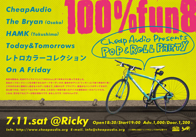 "BEATING!"ツアー四国編1日目です。 高松は歓楽街古馬場、場末のオアシスと巷で噂のRicky(リッキー)にて! 香川でブライアンが観れるチャンスです。 お近くにお住まいの方、ぜひぜひ遊びに来てください。 CheapAudio Presents[100%fun8] 7/11(土)高松RICKY (高松市古馬場町8-30 松本ビル5F) 出演: CheapAudio The Bryan(大阪) HAMK(徳島) today&tomorrows レトロカラーコレクション On A Friday Open18:30/Start19:00 Adv.1000/Door.1200(D代別途) info: http://www.cheapaudio.org