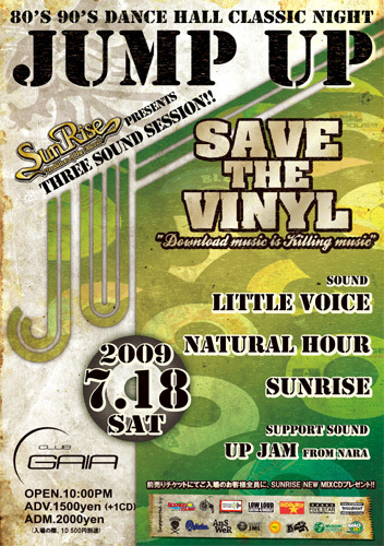 次の世代へも残していきたいレゲエダンスホール文化の根源でもあるレコードプレイを存分に堪能できるサウンドナイト!!サポートサウンドにはJUMP UPではもうおなじみのUP JAM!!