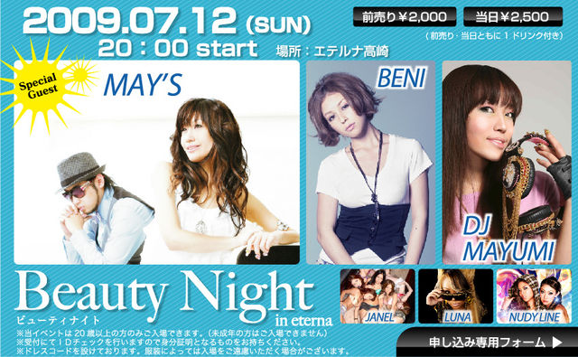 告知、失礼します! なんと結婚式場でもある「エテルナ高崎」で開催される [BEAUTY NIGHT] 出演者には、DJ MAYUMI , MAY'S , BENI ...など 今、旬の豪華アーティストが参加 結婚式場でのイベントという余り経験できない会場でもありますので この機会に是非、遊びに来てください 以下詳細です↓ [BEAUTY NIGHT] 群馬県高崎市のチャペル「エテルナ高崎」にて、2007年より定期的に開催されてきたBeauty Night! メインコンセプトは、「大人が遊べる空間」 「美」を常に意識し、「美」を最も感じ