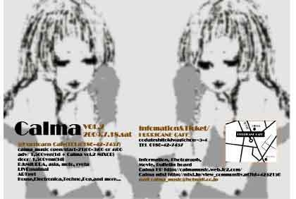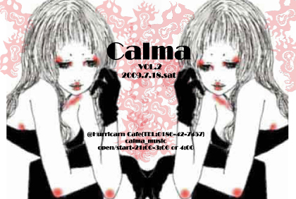 夏がやってきました!! えぇ〜もうなつだぁ!!とかってはっちゃけられる年でもないよぉ〜。とかうなだれてはいけません。それはきっと老化の始まり、若い人からおじいちゃんおばあちゃんの入れ歯がはずれるまで、 つまり、老若男女、ろうにゃくにゃんにょ。 幅広くハウス好きに愛されたいイベント 「calma」 のvol.2がやってきました! 【Calma Vol.2】 House,Electronica,Techno,Pop... @HURRICANE CAFE(odate) OPEN 21:00〜 ADV \1500(1D) DOOR \1500(1D) DJ/ MIURRA asia moto ryota Dan