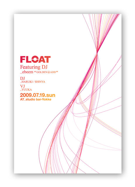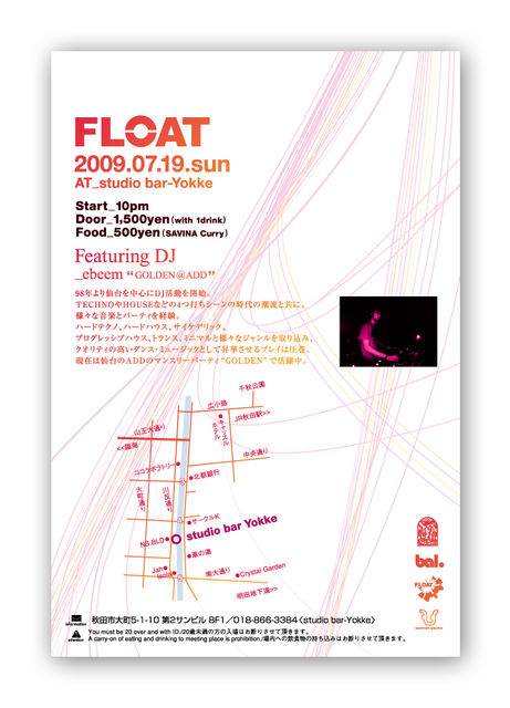 告知をさせてください。 FLOAT @ studio bar-Yokke 2009.7.19(Sun) Start_10pm Door_1500yen(With 1 Drink) Food_500yen(SAVINA Curry) Featuring DJ_ebeem(GOLDEN @ ADD) DJ_HARUKI / SHINYA VJ_YUUKA ebeem Profile 98年より仙台を中心にDJ活動を開始。 TECHNOやHOUSEなどの4つ打ちシーンの時代の潮流と共に、様々な音楽とパーティを経験。 ハードテクノ、ハードハウス、サイケデリック、プログレッシブハウス、トランス、ミニマルと様々なジャンルを取り込み、クオリティの高いダンス・ミュージックとして昇華さ