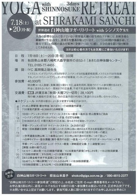 7/18(土)〜7/20(月・祝)の3日間、故郷の秋田県八峰町でヨガ・リトリート(合宿)を開催します。講師にはインターナショナル・ヨガ・センター(IYC)のシンノスケ先生をお招きします。 ヨガに興味ある方、さまざまな流派の経験者の方、世界遺産の白神山地に興味のある方…どうぞお気軽にご参加ください! 地元住民を対象に、18日(土)と19日(日)夜に「はじめてのヨガ」クラスも開催する予定です。 ご質問、お申し込みは山本までメッセージを送信してください。 みなさんのご参加をお待ちしております