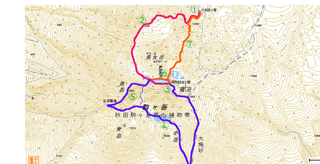 秋田駒ヶ岳に、八合目までバス利用で登山しようという企画です。 (ちなみに、この時期のこの時間帯はマイカーでは八合目に登れません) 集合時間は、まだ変動する可能性がございますが、「アルパこまくさ」に7時20分です。 行程は、 アルパこまくさに集合〜7時42分のバスで八合目まで。括弧内の数字は、画像の地図の番号です。 (1)8時10分頃、八合目を出発〜(2)片倉岳展望台〜(3)阿弥陀池…ここまで約1時間 (3)阿弥陀池〜(横岳)〜(大焼砂)〜(4)馬場ノ小路・駒池〜(5)男岳…約1時間 …(5)のあたりが今回の難所。男岳ピークはパスとな
