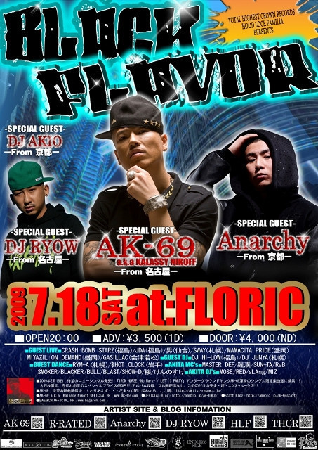 管理人様告知失礼します THCR & HLF presents 〜BLACK FLAVOR SPECIAL〜 2009.7.18(土) @FLORIC (秋田市土崎セリオン横) OPEN 20時 CLOSE 朝まで TICKET 前売り \3500(1D) *250枚限定、 5月3日より発売開始 詳細は下へ。 当日 \4000(NO DRINK) 【SPECIAL GUEST LIVE】 AK-69 a.k.a Kalassy Nikoff (名古屋) ANARCHY (京都/R-RATED) 【SPECIAL GUEST DJ】 DJ RYOW (名古屋/BALLERS) DJ AKIO (京都/R-RATED) 【GUEST LIVE】 CRASH BOMB STARZ (福島) JDA (福島) 男 (仙台) SWAY (札幌) MAMACITA PRIDE