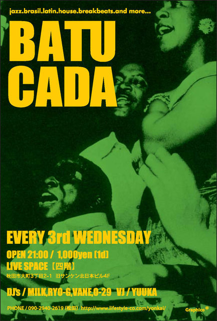 ブラジル音楽や、ダンスジャズや、 ラテンをベースにしたハウスやブレイクビーツを 主なジャンルとしたパーティーです。 南の海の光景や、陽光のきらめきや、心地いい風や、 暑い日中の木陰に待っている「ひんやりした気分」を 音楽で提供していきたいと思っております。 よろしくお願い致します。 "BATUCADA" 7.15(wed) at Live Space『四階』 open/start 21:00 1,000yen(1drink) DJ MILK RYO-G VANE 0-29 VJ YUUKA Live Space『四階』 秋田市大町3-2-1 サンケイ北日本ビル 4F http://lifestyle-co.com/y