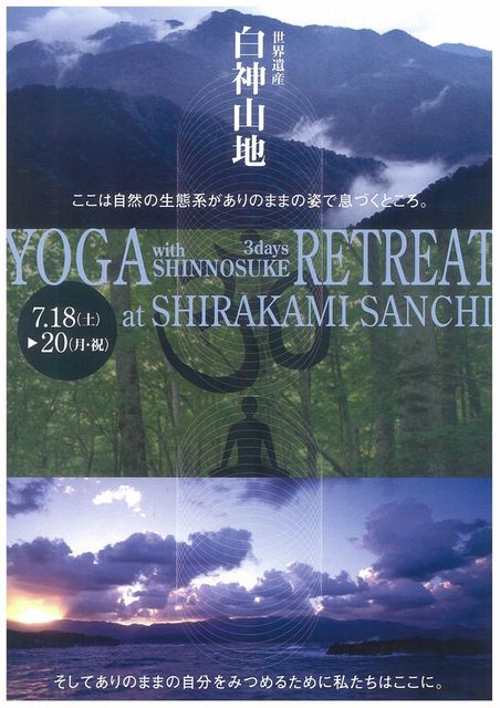 <世界遺産 白神山地ヨガ・リトリート> 人為の影響をほとんど受けていない世界最大級の原生的なブナ林には、多種多様な動植物が生息・自生し、貴重な生態系を保っています。ここでの3日間の体験を通じて、偉大で美しい自然の恵みを精神と身体いっぱいに感じ、自分自身を思い切り解放してみませんか? 日程:7/18(土)〜7/20(月・祝) 3日間 場所:秋田県八峰町 (日本海を望み、青森県と秋田県の県境に位置します) 講師:シンノスケ先生、インターナショナル・ヨガ・センター(IYC) ヨガに興味ある方、さまざまな流派の経験者の方